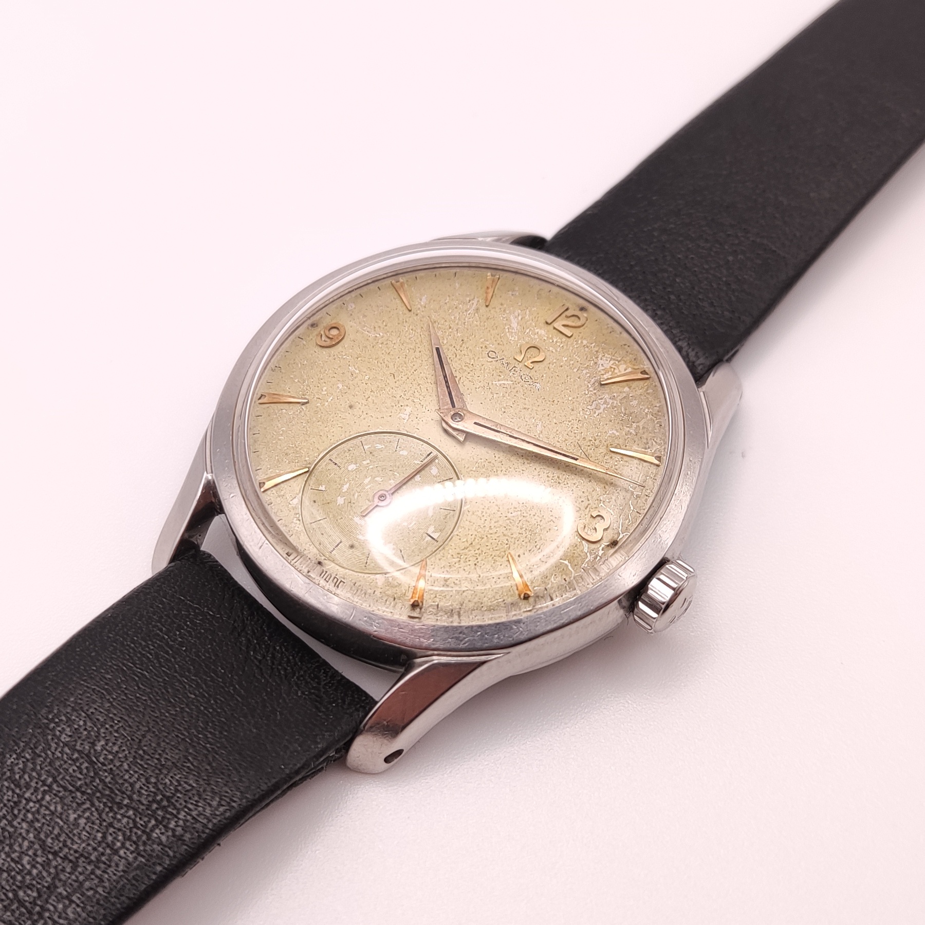This particular specimen features a breathtakingly aged dial that collectors affectionately refer to as having a “stardust” or “sand-textured” patina. This organic transformation has turned the dial into a unique canvas of warm, champagne, and honey tones. The golden Arabic numerals at 3, 9, and 12 o’clock, combined with the recessed sub-second register at 6, create a multi-dimensional look that captures light in a way no modern, mass-produced dial ever could.